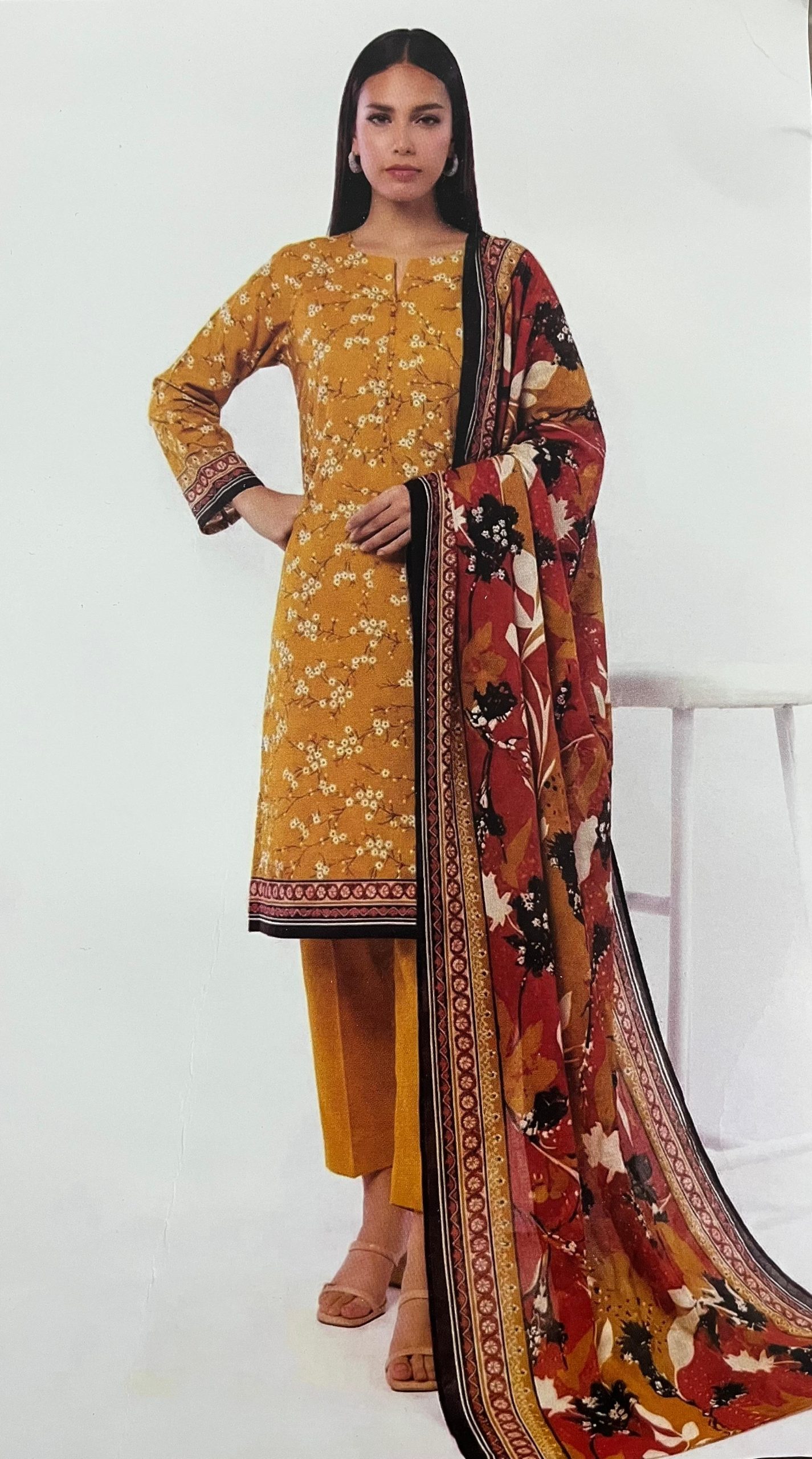 Infuse your wardrobe with the warm, glowing tones of “Amber Autumn.” This 3-piece unstitched ensemble is a tribute to transitional seasonal beauty, featuring a rich mustard base decorated with delicate white floral sprigs. With its bold, earthy-toned dupatta and structured aesthetic, this suit is designed for the woman who appreciates a vibrant yet grounded look.