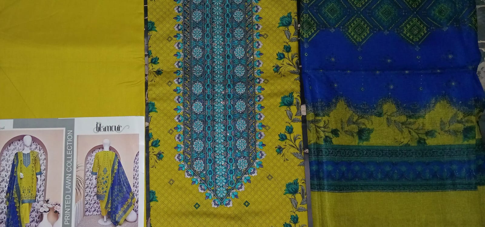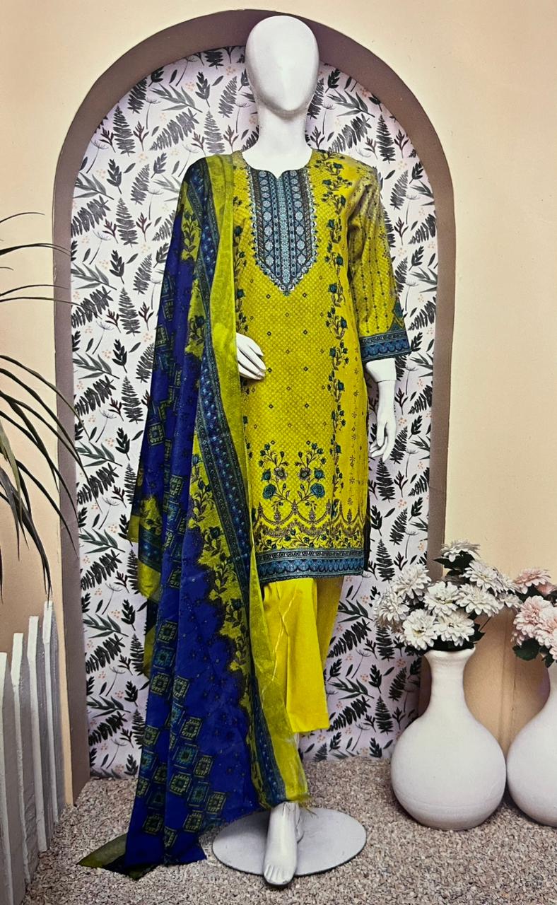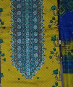 Enliven your festive wardrobe with “Citrus Bloom,” a vibrant ensemble that radiates freshness and modern grace. This 3-piece unstitched suit features a refreshing lime-green base accented with intricate cobalt blue floral patterns. Combining traditional motifs with a contemporary color palette, this outfit is designed for the woman who wants to make a bold, sophisticated statement during the summer season.