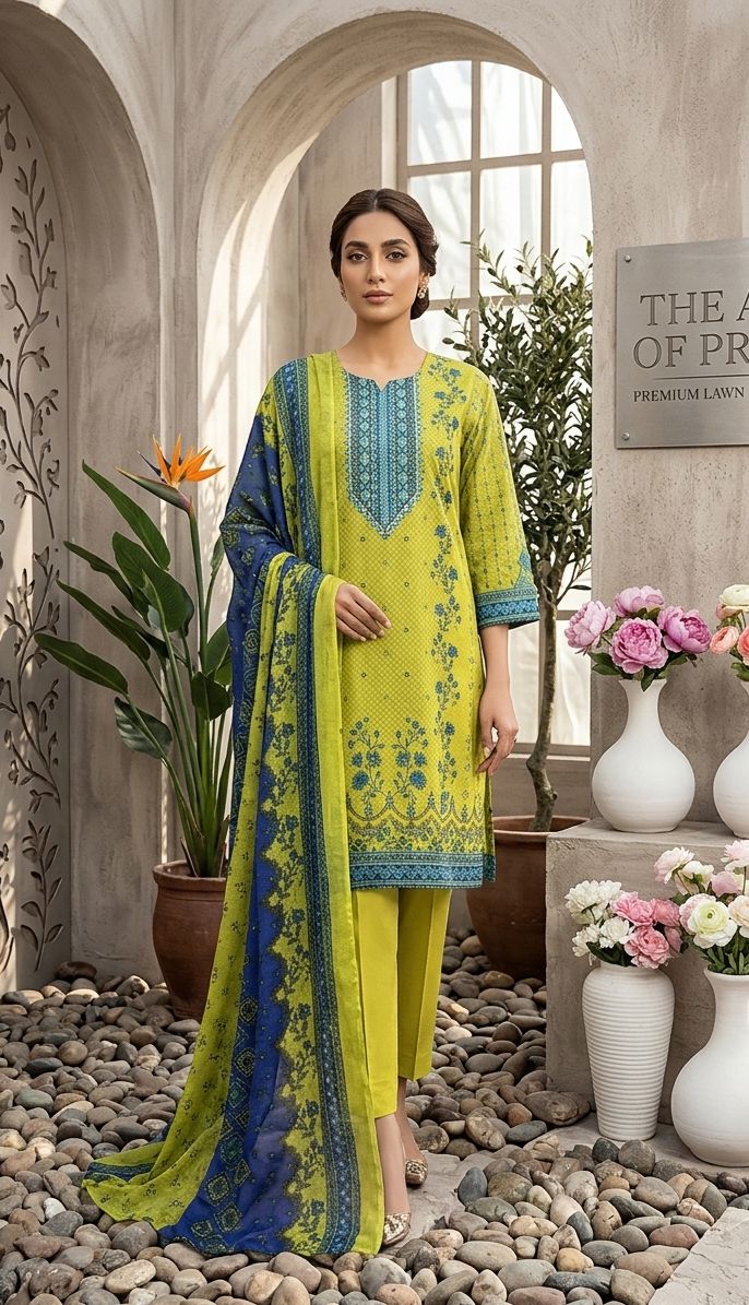 Shirt: Premium grade Summer Lawn shirt in a bright citrus lime tone, decorated with delicate blue floral vines and geometric micro-prints. The neckline is highlighted by a beautifully detailed V-shaped embroidered placket in deep sapphire blue, complemented by matching ethnic borders on the sleeves and hem.