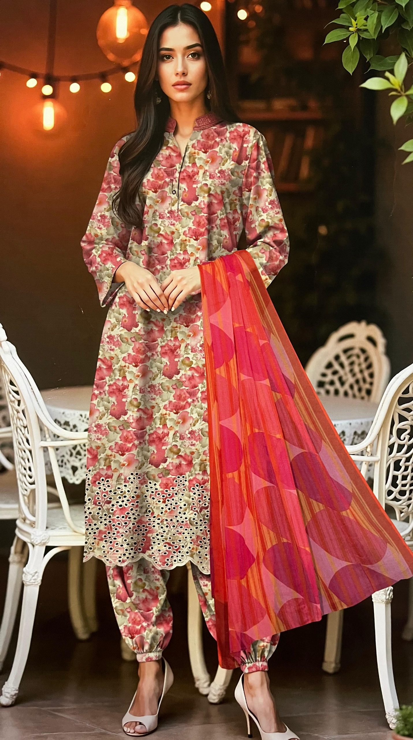 Shirt: Premium Lawn shirt featuring a lush digital floral print in shades of rose pink, coral, and sage green. The neckline is designed with a sophisticated band collar, and the hem (daman) is adorned with heavy Chickankari embroidery and delicate laser-cut detailing for an airy, elegant finish.