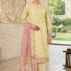 Shirt: Premium Summer Lawn shirt in a soft golden-yellow hue, featuring a refined central panel with white embroidery and vertical geometric patterns. The sleeves and hem are detailed with rich chocolate-brown and tan ethnic borders, adding a structured finish to the airy base.