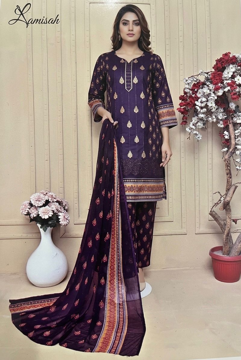 Exude royalty with “Imperial Plum,” a majestic ensemble that combines deep, rich tones with shimmering gold accents. This 3-piece unstitched suit features a sophisticated dark purple base illuminated by heritage-inspired gold-dust motifs. It is an exceptional choice for evening festivities, offering a look of high-end luxury and traditional grace.