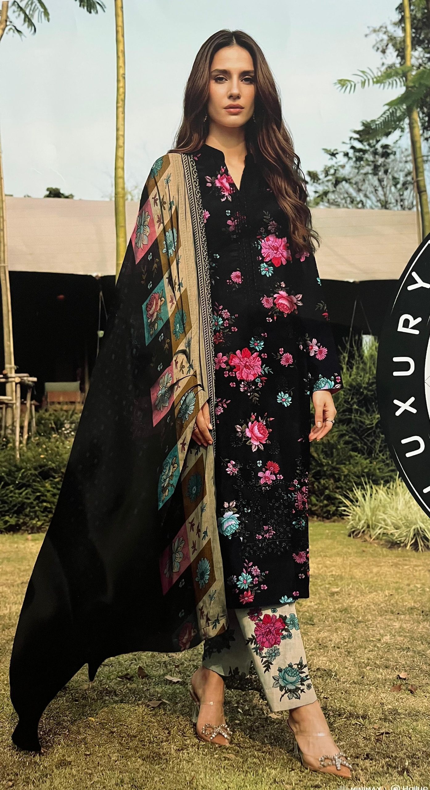 Make a bold statement with “Noir Blossom,” a masterpiece of contrast and floral artistry. This 3-piece unstitched suit features a deep raven-black base that serves as a dramatic canvas for vibrant pink and teal floral prints. Designed for the woman who loves a mix of mystery and femininity, this ensemble is a standout choice for evening gatherings and sophisticated daily wear.