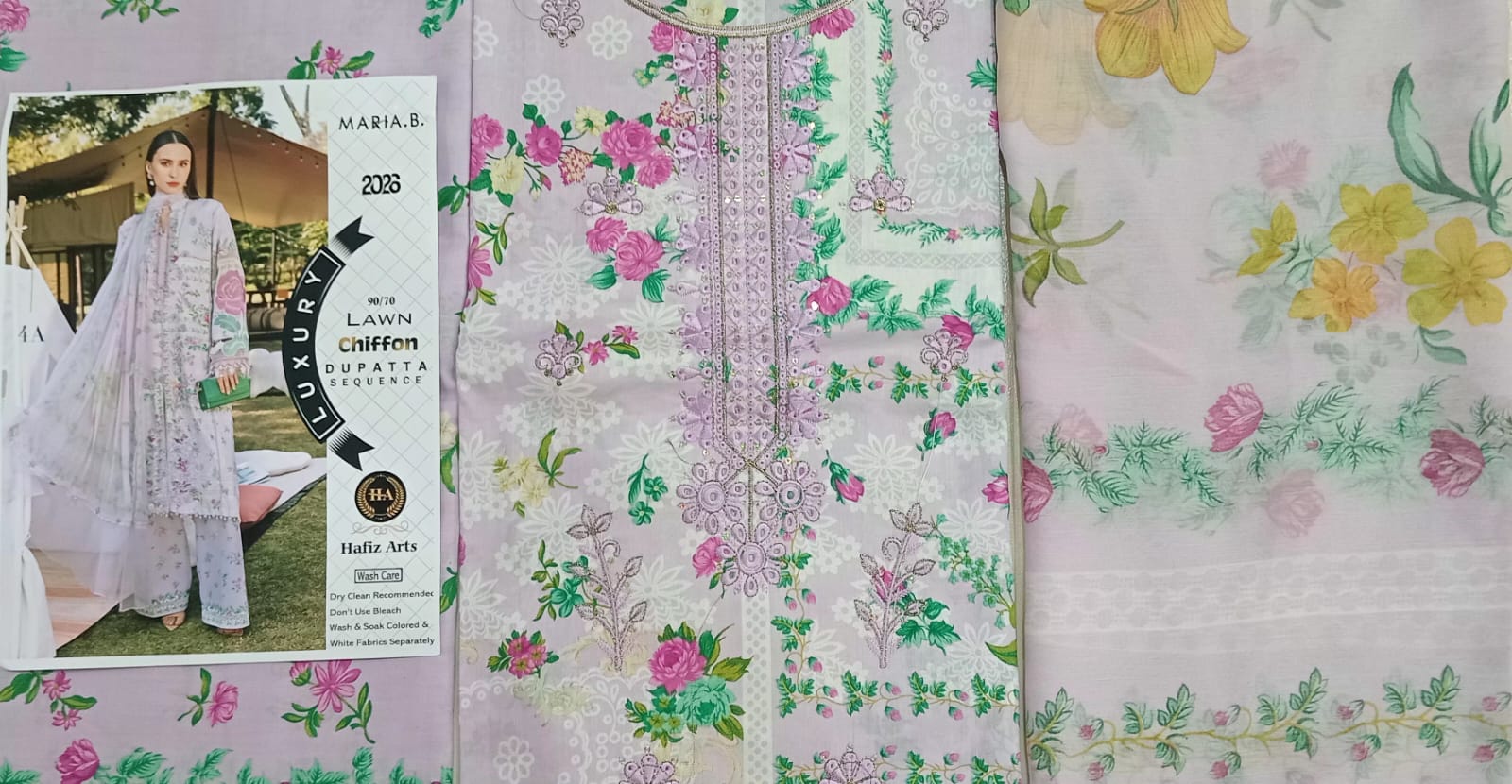 Fabric: High-Grade Summer Lawn (Shirt & Trouser), Fine Printed Chiffon/Organza Blend (Dupatta).